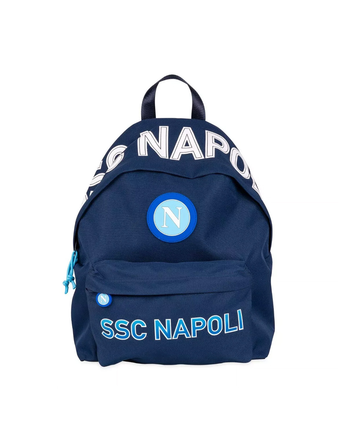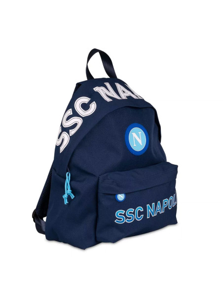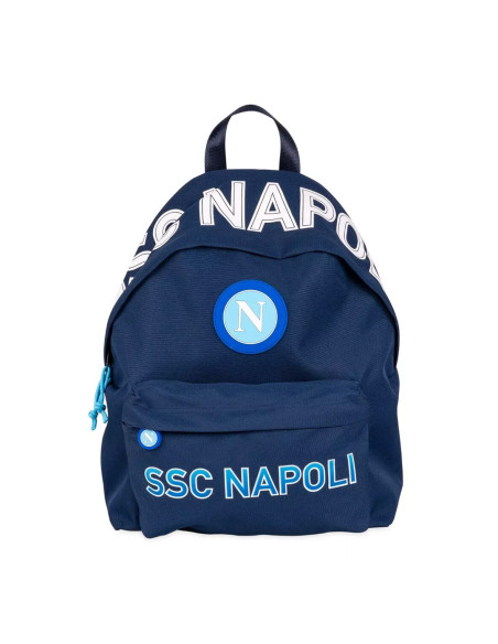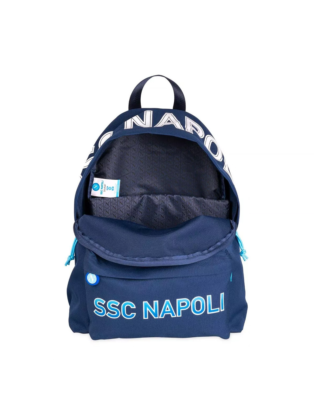 Official SSC Napoli American-style backpack in dark blue. Features the club's iconic circular logo with the light blue “N”, SSC NAPOLI lettering on the front pocket and across the top flap. Spacious interior includes a padded compartment for laptop or tablet, with custom inner lining featuring a repeating “N” pattern. Sturdy zip closure and padded adjustable shoulder straps ensure everyday comfort. Ideal for school, university, or any Napoli supporter on the go.
