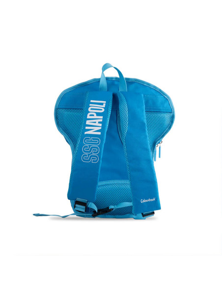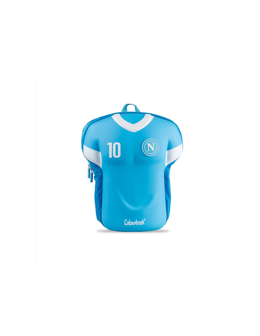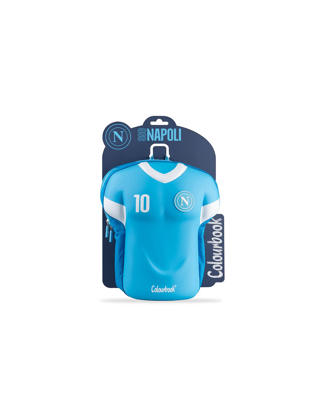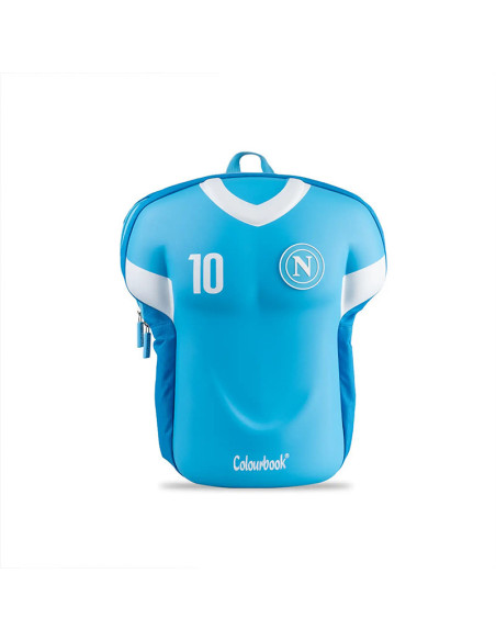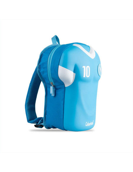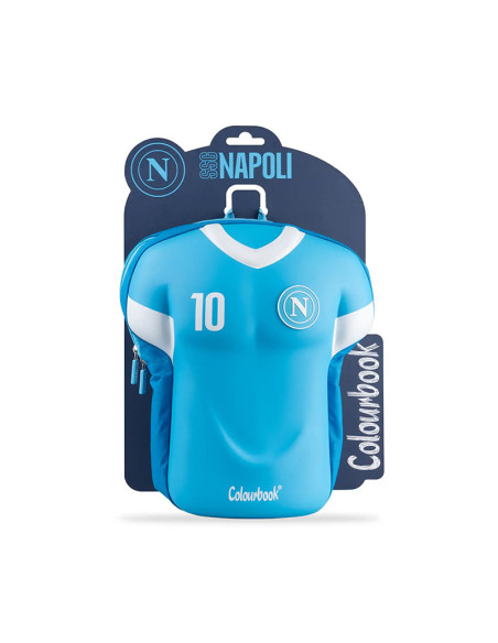 Official SSC Napoli backpack by Colourbook with a unique 3D hard-shell design shaped like the team's jersey. The front panel features the number 10, white collar, and raised SSC Napoli crest on a bright blue background. Adjustable padded straps with SSC NAPOLI branding and a breathable back panel offer comfort and practicality. The interior compartment provides space for school supplies and daily essentials. A bold choice for young fans.