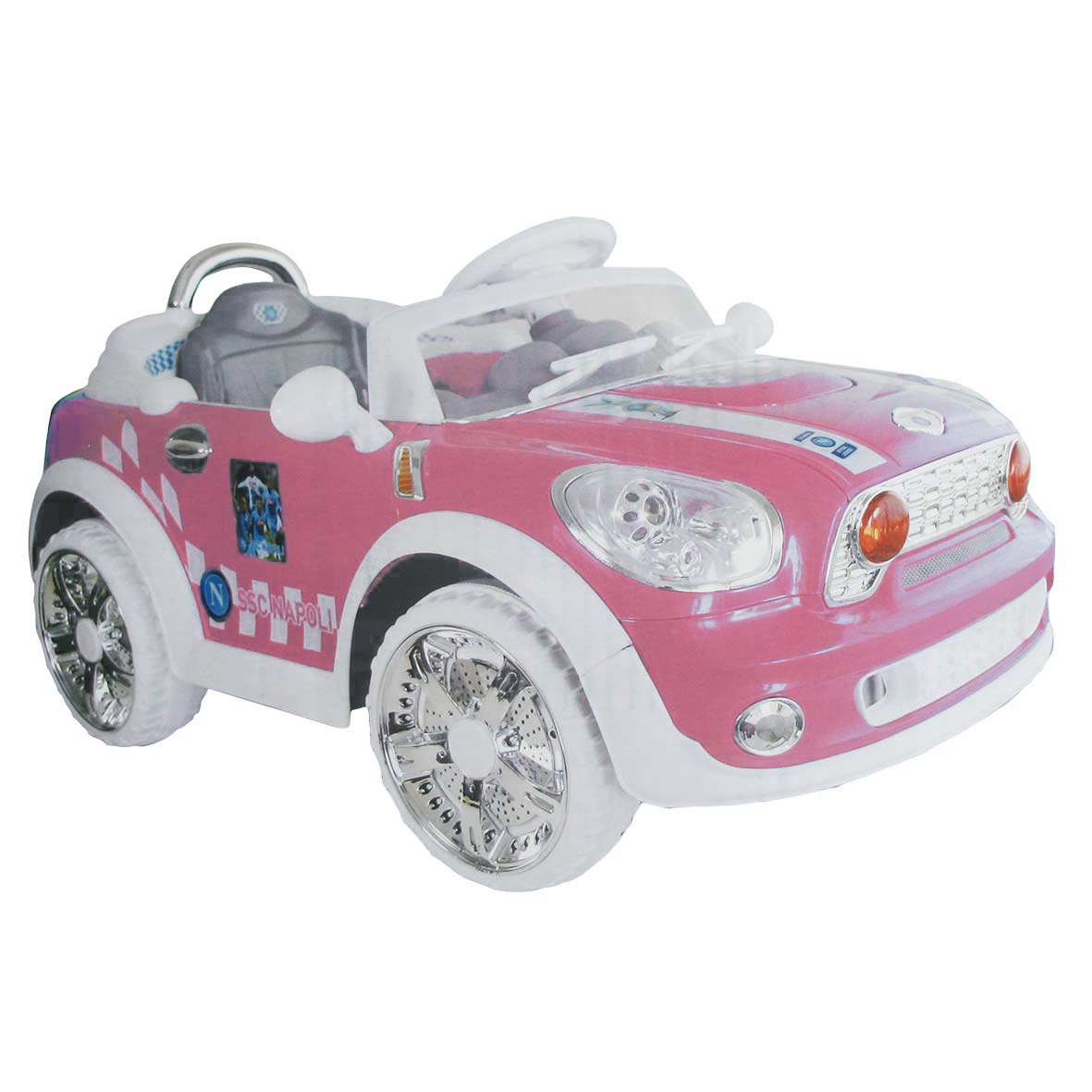 Macchina elettrica giocattolo cabrio colore rosa con grafiche ufficiali SSC Napoli. Scocca dettagliata con parabrezza, specchietti e cerchi effetto cromato. Guida tramite telecomando per il controllo da parte dell’adulto; volante e cruscotto per la guida a bordo del bambino. Seduta confortevole, ruote larghe per maggiore stabilità e paraurti anteriore. Ideale per sfrecciare in sicurezza nelle aree gioco e per regalare ore di divertimento alle piccole tifose azzurre.