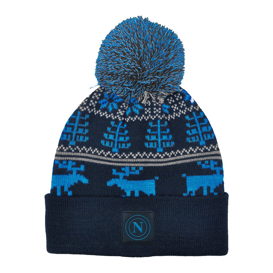 Cappello ufficiale SSC Napoli in morbida lana blu con fantasia natalizia, decorato con alberi, renne e dettagli in azzurro.