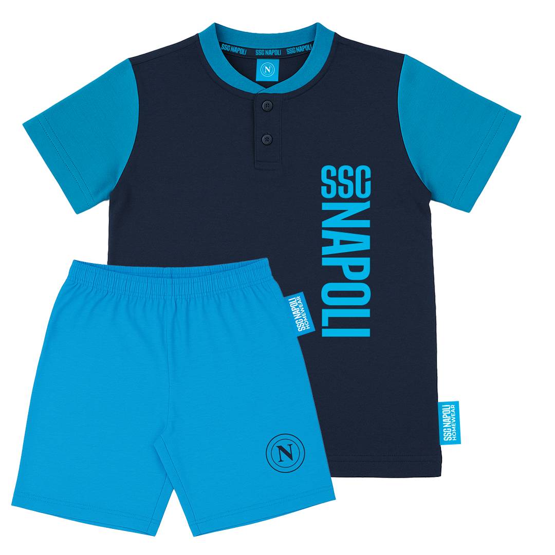 Completo estivo ufficiale SSC Napoli da uomo, composto da t-shirt bicolore blu e celeste con scritta verticale “SSC NAPOLI” e pantaloncini coordinati. Il design moderno con colletto a due bottoni e dettagli a contrasto richiama i colori iconici del club. Realizzato in morbido cotone traspirante, offre massimo comfort e libertà di movimento, ideale per il tempo libero o le giornate estive.
