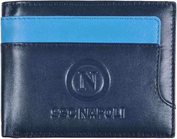 Portafoglio ufficiale SSC Napoli realizzato in 100% pelle di alta qualità. Design bicolore blu e celeste con logo “N” impresso e scritta SSC Napoli a rilievo sul frontale. Interno organizzato con molteplici scomparti per carte, documenti e banconote, impreziosito da un inserto con scudetto tricolore cucito. Linea moderna e compatta, ideale per un uso quotidiano elegante e sportivo.
