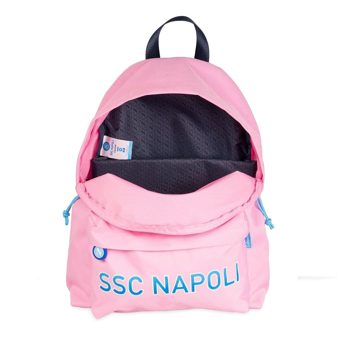 Zaino ufficiale SSC Napoli dal design americano, realizzato in resistente tessuto rosa con dettagli blu navy. Presenta il logo SSC Napoli in rilievo sul fronte e la scritta “SSC NAPOLI” stampata sulla tasca anteriore con chiusura a zip. Gli spallacci sono imbottiti e regolabili per il massimo comfort.