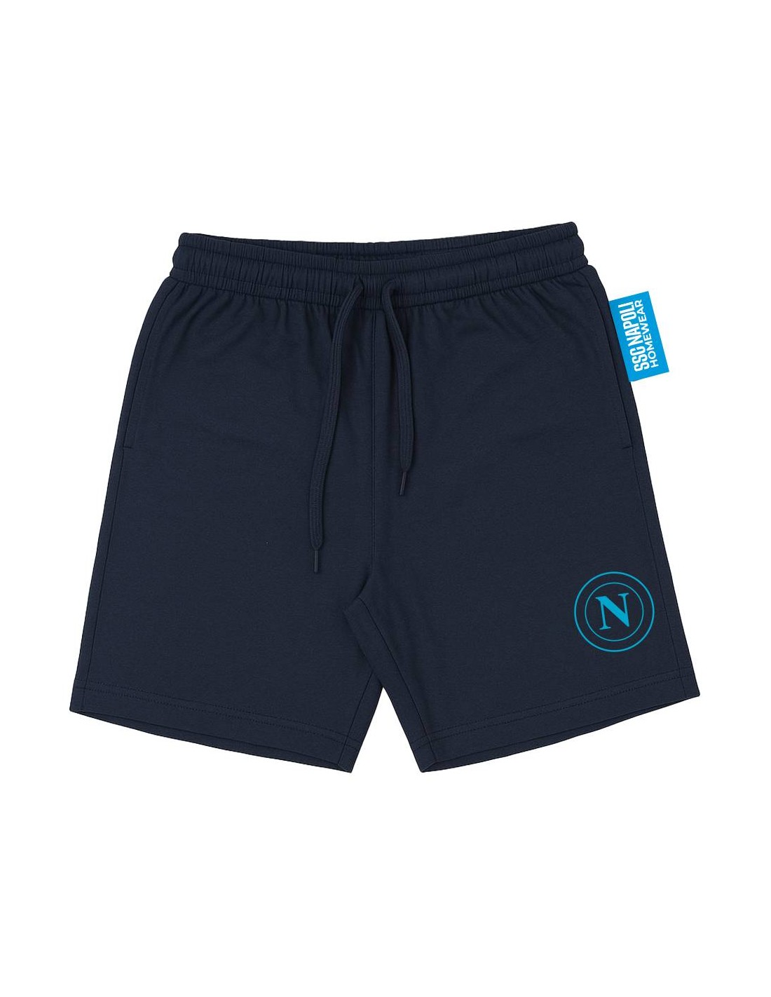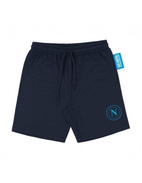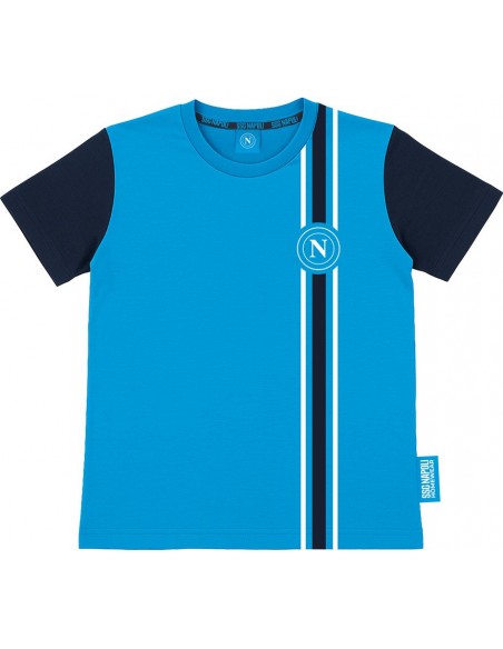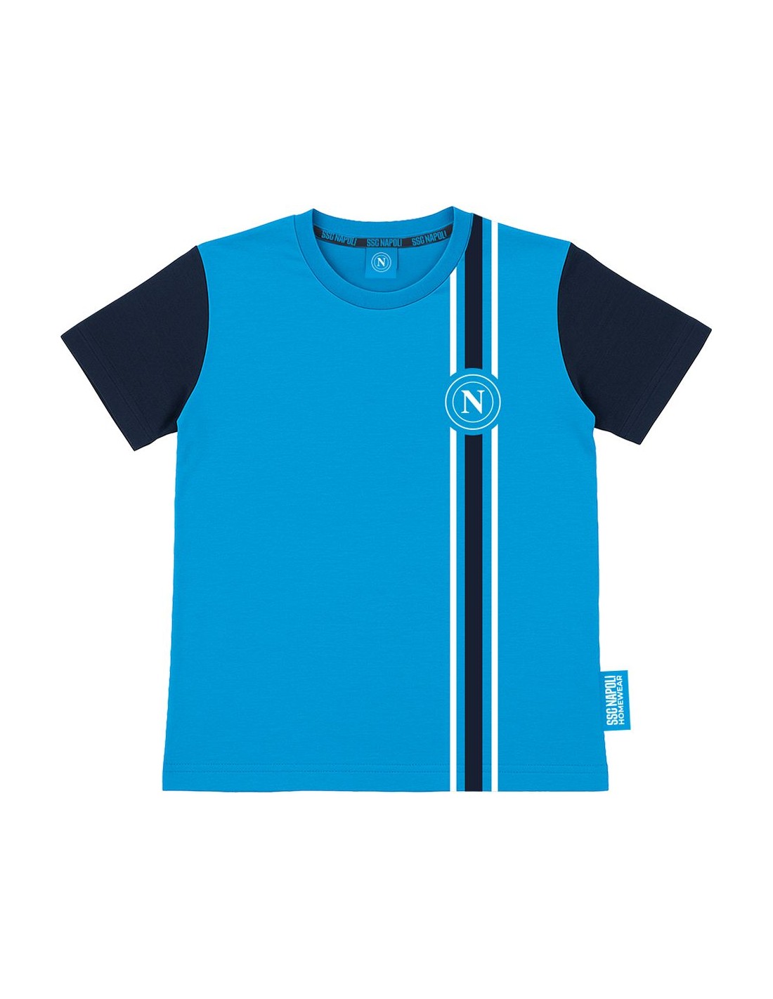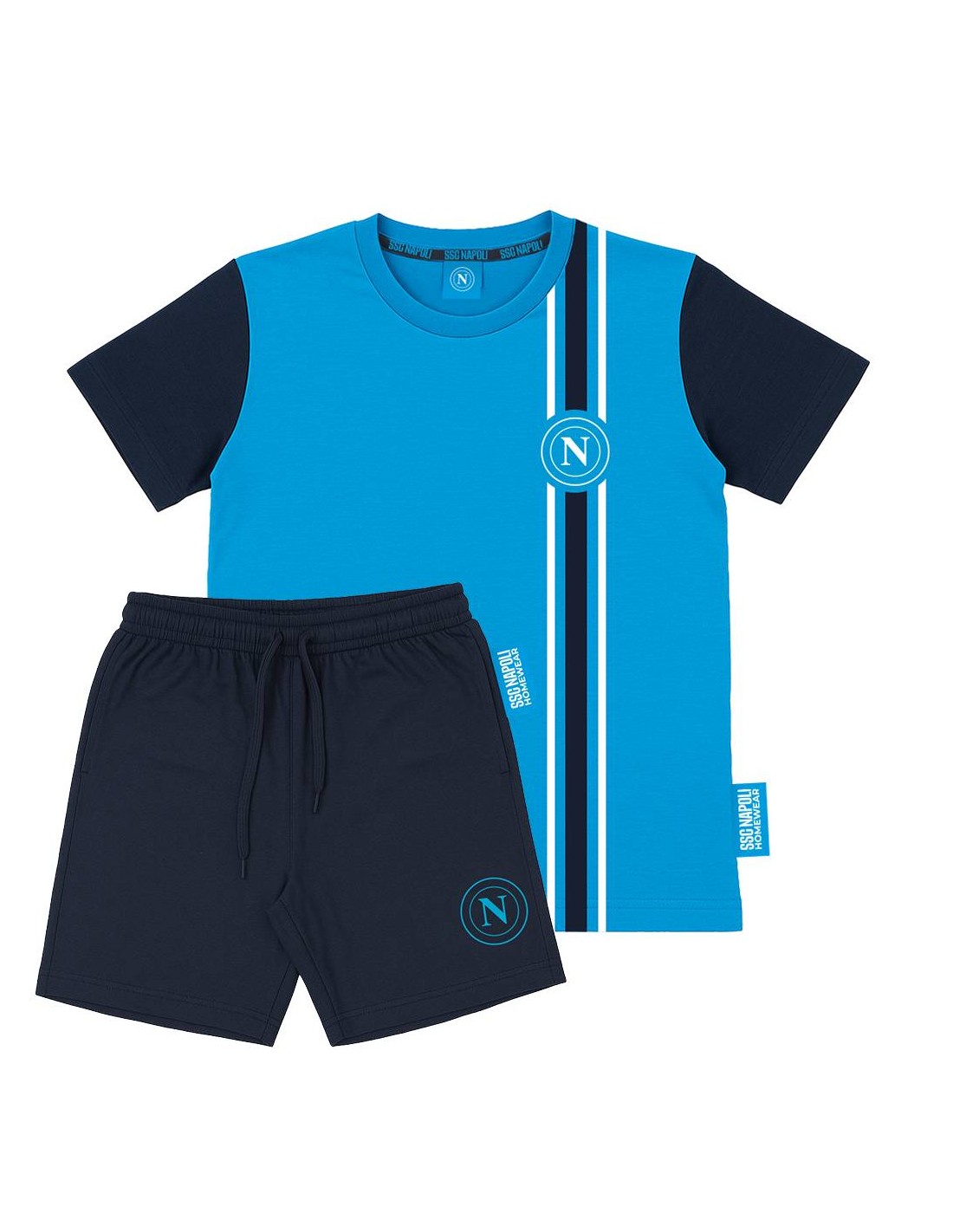 Official SSC Napoli summer set for kids, featuring a sky blue t-shirt with navy sleeves and matching navy shorts. The shirt stands out with dual vertical stripes and a centered round SSC Napoli logo on the chest. Navy contrast sleeves and a round collar detailed with SSC Napoli branding on the inner neck add a modern, sporty touch. The shorts include an adjustable drawstring and the club’s logo printed on the left leg, with official product tags. A dynamic and stylish set for young Napoli fans during summer.