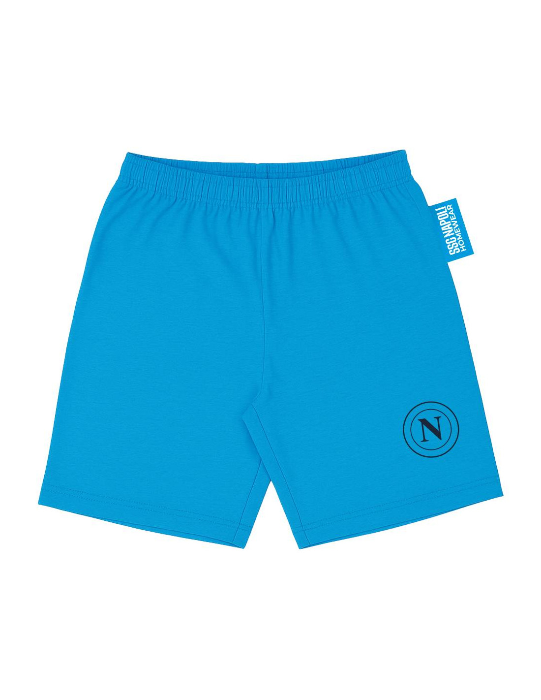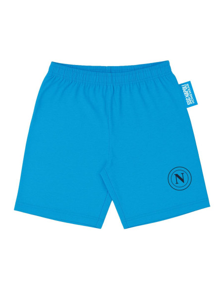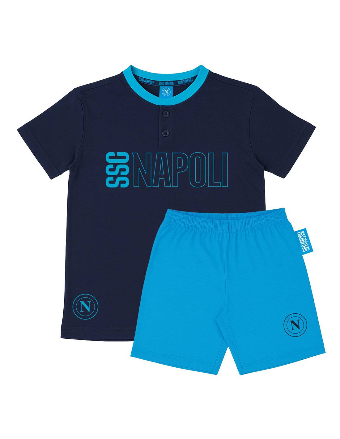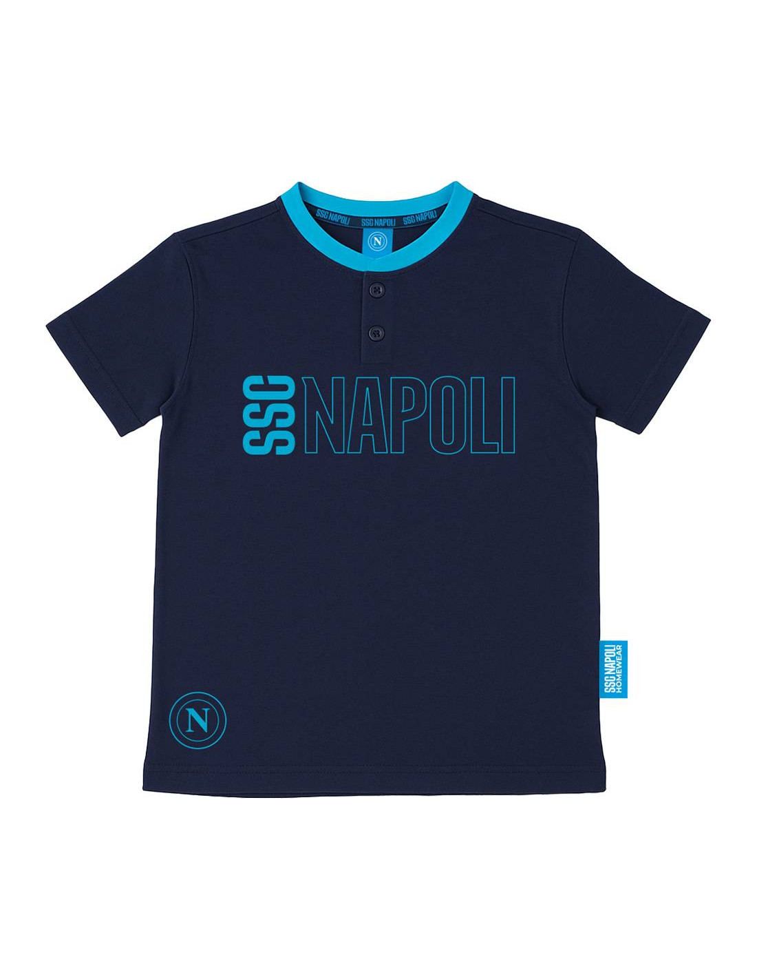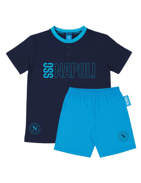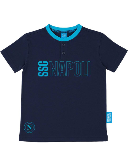 Official SSC Napoli summer set for kids, including a navy t-shirt with a sky blue collar and matching light blue shorts. The shirt features a two-button placket, central “SSC Napoli” lettering in a modern design, and the circular SSC Napoli logo at the bottom. The shorts are fully sky blue with the club logo printed on the left leg. Both garments come with the official SSC Napoli product tag. A practical and vibrant outfit for young fans to wear all summer long.