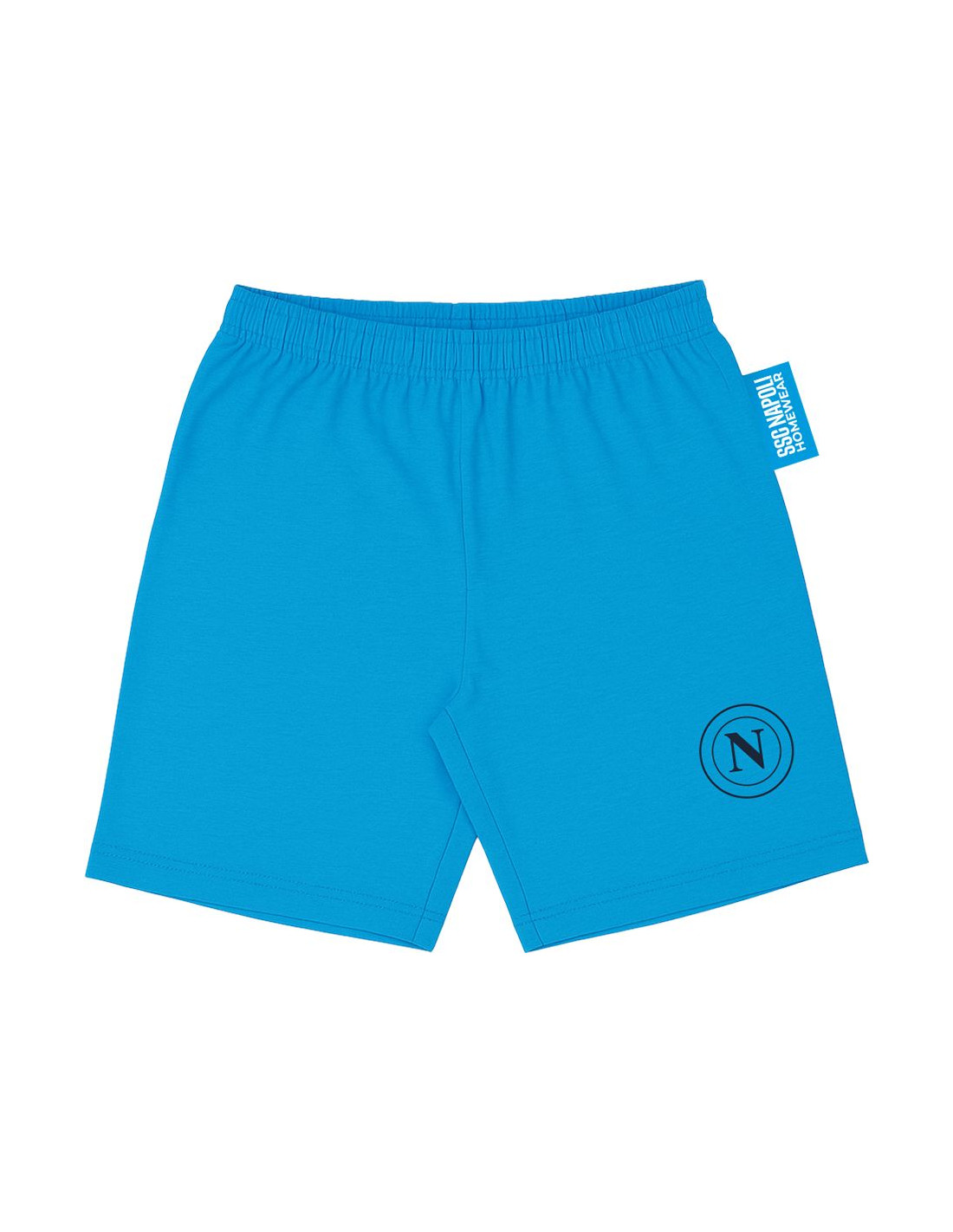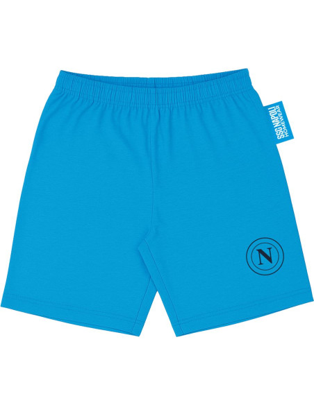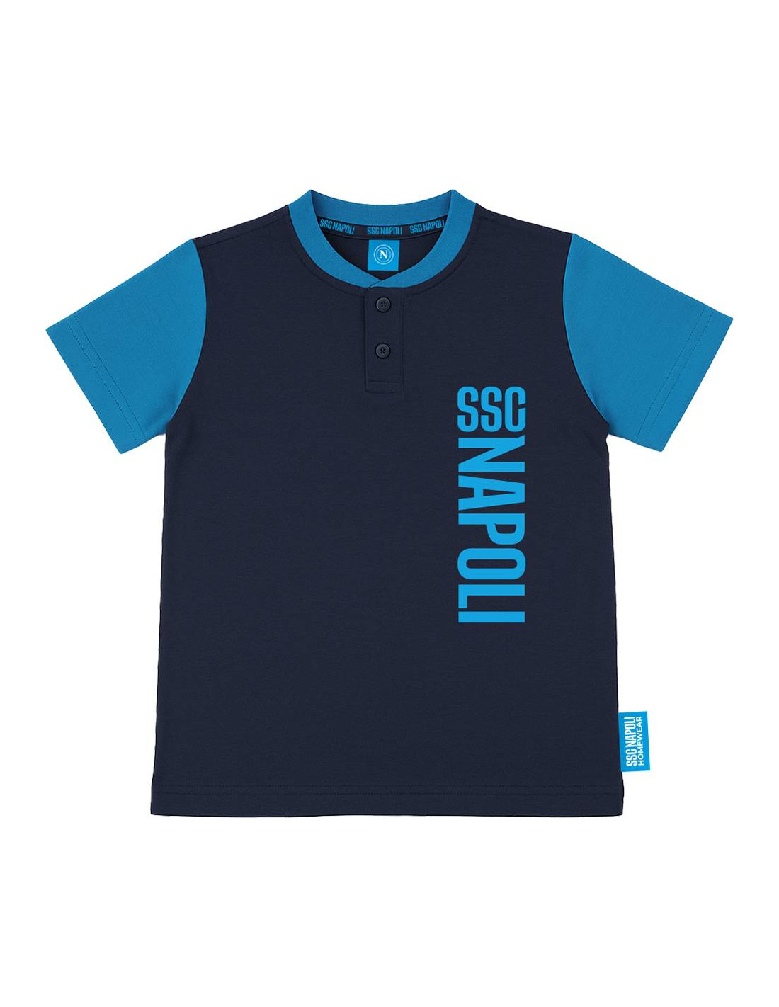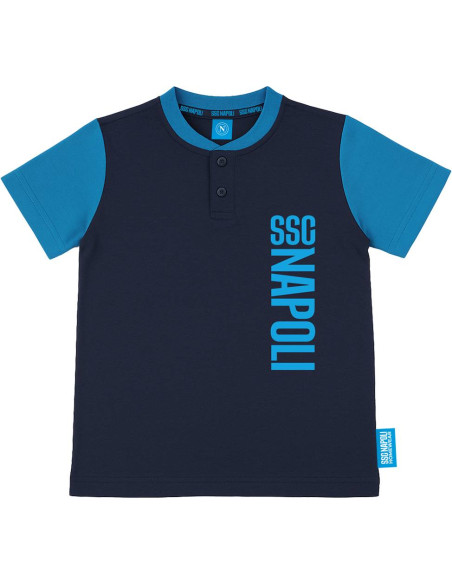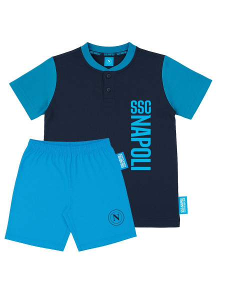 Official SSC Napoli summer outfit for kids, featuring a matching short-sleeved t-shirt and shorts. The shirt comes in a stylish navy and sky blue design with a two-button collar and bold vertical “SSC Napoli” print on the left chest. The light blue shorts include the SSC Napoli logo on the left leg. Both garments carry the official SSC Napoli and “Official Product” tags. Perfect for young fans to wear during the summer season.