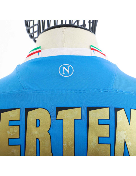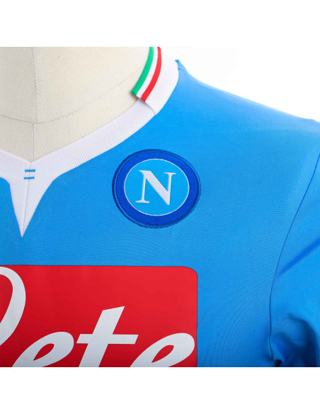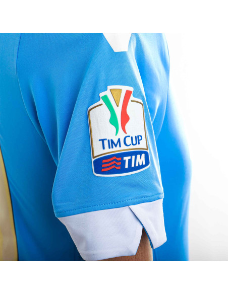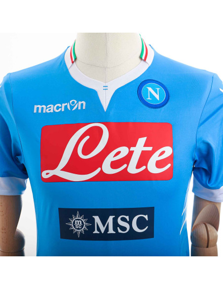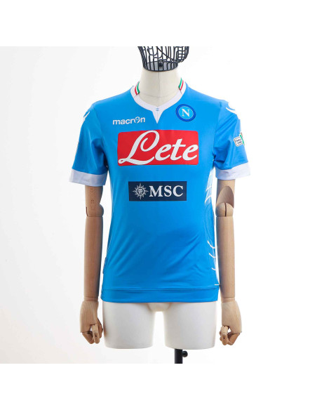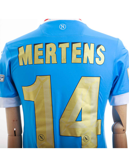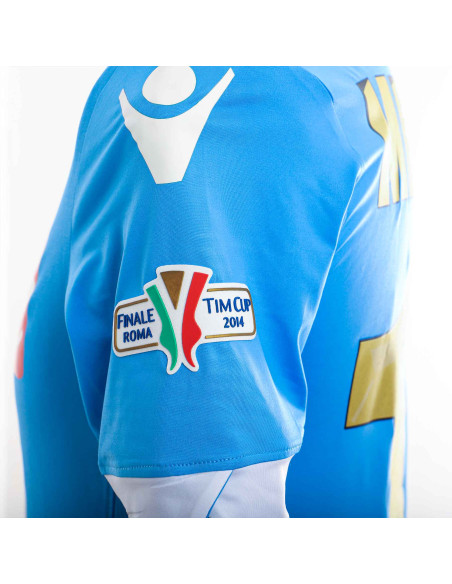 La maglia è prodotta da Macron nel colore societario azzurro con nome e numero in color oro Mertens 14. Il colletto richiama il tricolore e riporta colori brillanti. Gli sponsor commerciali sul fronte sono in ottime condizioni. Maniche con bordino bianco, su quella di sinistra è apposta la patch " FINALE TIM CUP - ROMA 2014" e quella di sinistra la classica toppa "TIM CUP".