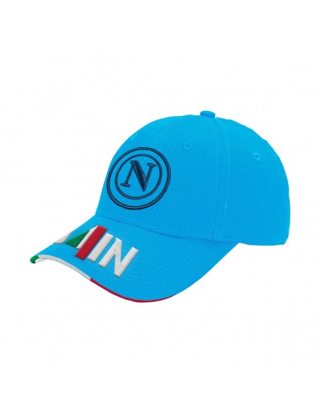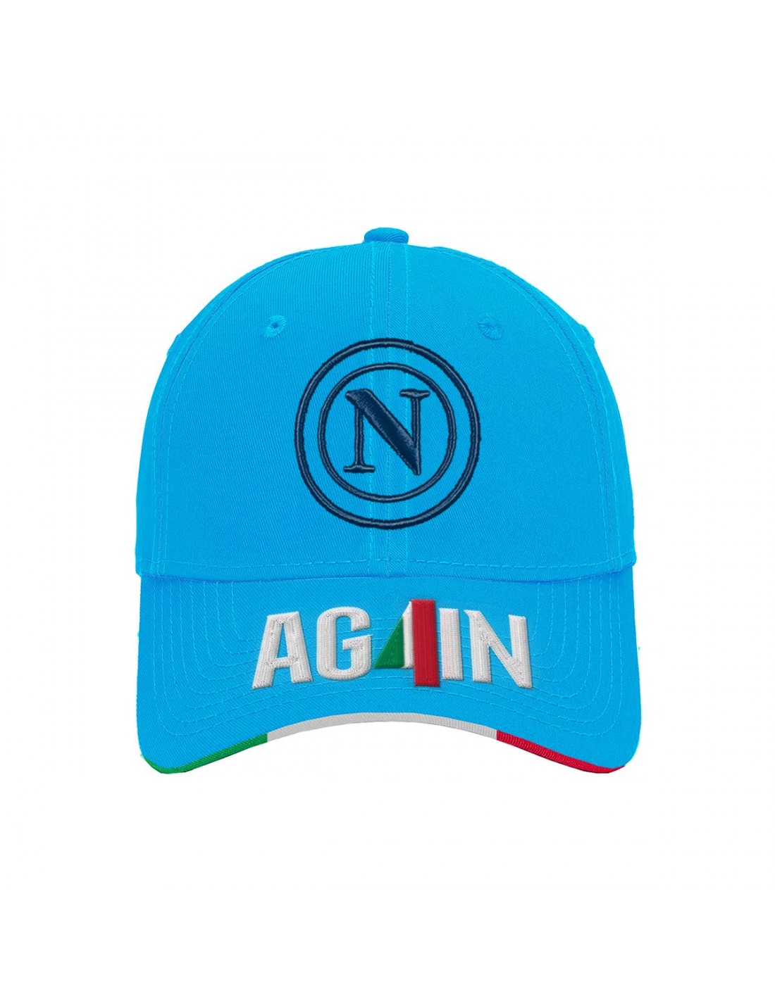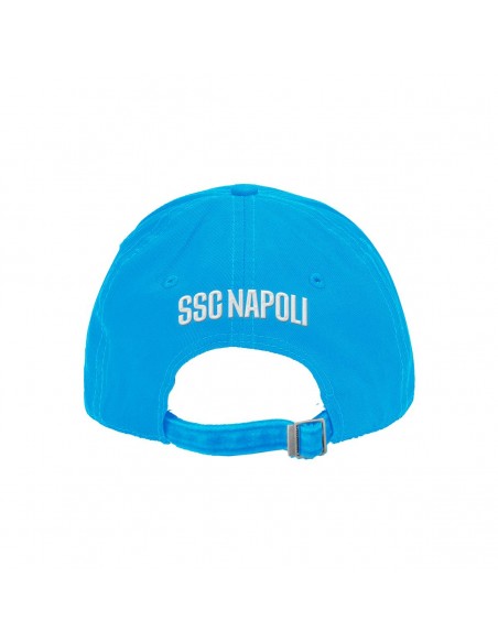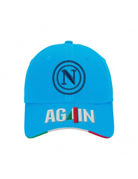 Cappello snapback ufficiale SSC Napoli, modello baseball, colore azzurro con visiera tricolore. Sul fronte è presente il logo circolare SSC Napoli ricamato e la scritta "AGAIN" con inserto bandiera italiana. Sul retro, scritta SSC NAPOLI ricamata in bianco e chiusura regolabile in tessuto con fibbia metallica. Internamente nastratura personalizzata SSC NAPOLI. Accessorio iconico e contemporaneo, perfetto per i tifosi azzurri.