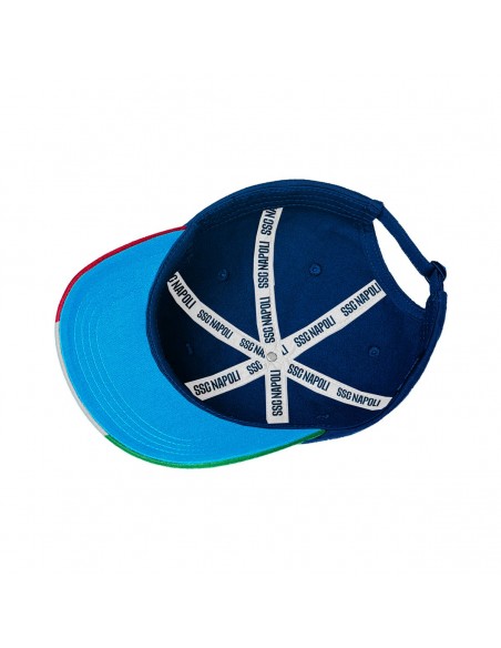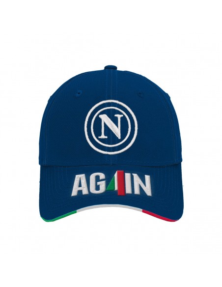 Cappello ufficiale SSC Napoli con base blu, visiera decorata con i colori del tricolore italiano e scritta "AGAIN" sul frontino. Logo SSC Napoli ricamato sul davanti e scritta SSC Napoli ricamata sul retro. Interno con bande personalizzate SSC Napoli e chiusura regolabile. Accessorio celebrativo per lo Scudetto, ideale per i tifosi partenopei.