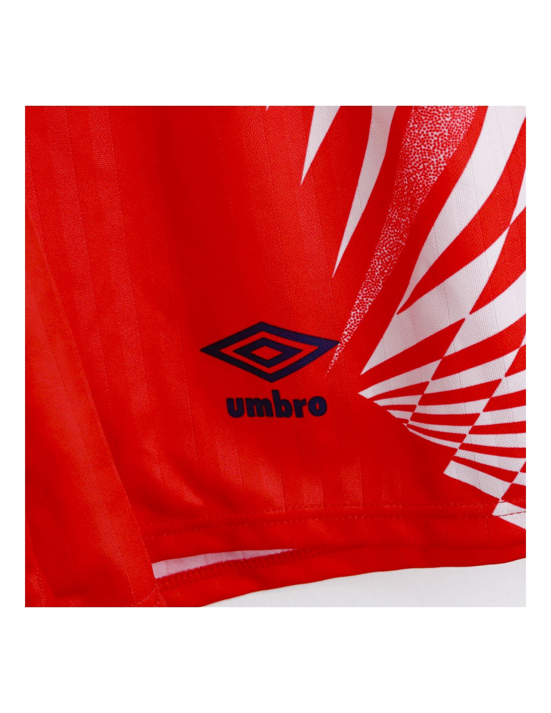 Modello di colore rosso con dettagli bianchi, con lo stemma del club sulla gamba destra.